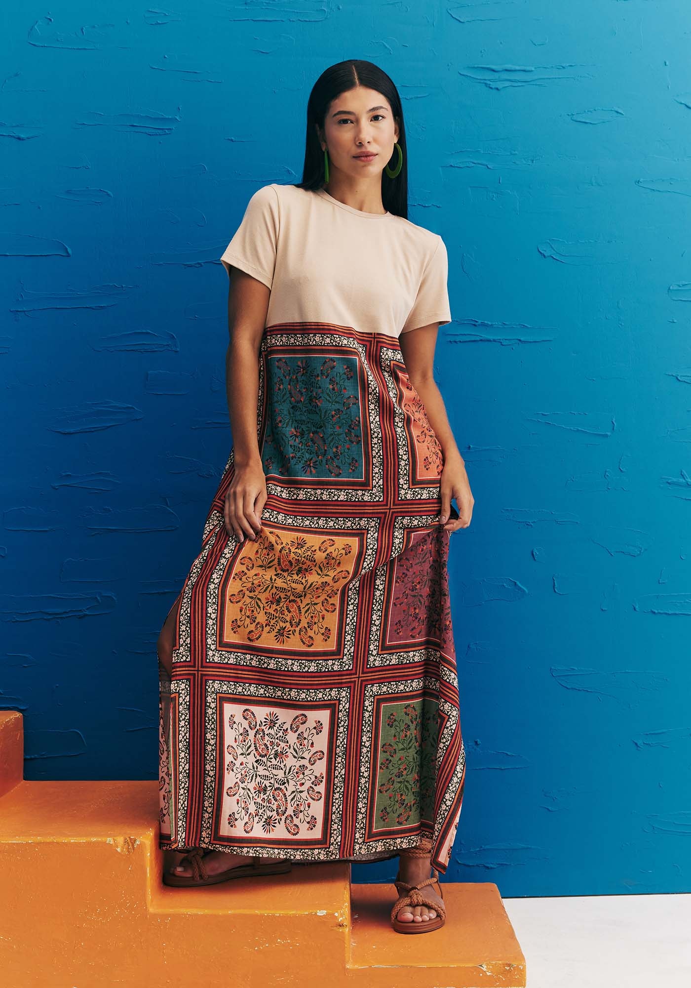 O vestido midi com mix de tecidos é modeloversátil e confortável. É confeccionado com dois tipos de tecido, a malha e aviscose. Além da estampa belíssima, o vestido com shape soltinho possui mangacurta e decote canoa.