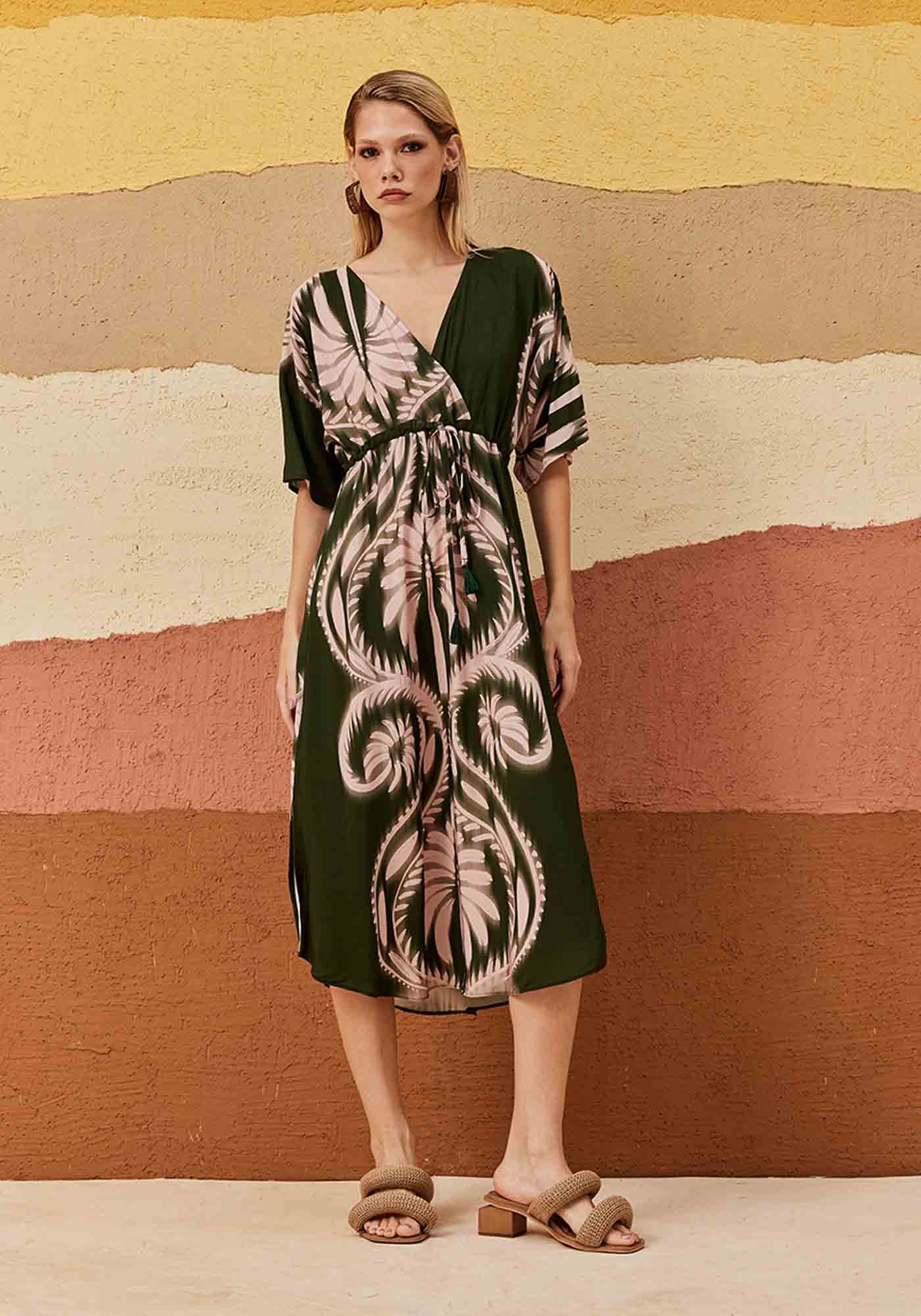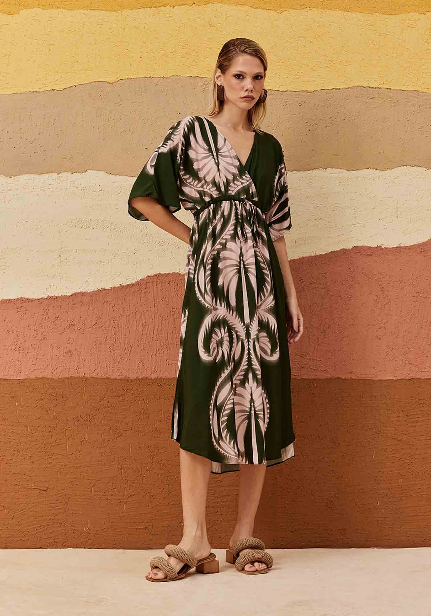 O vestido midi é confeccionado em tecido 100% viscose. Com modelagem soltinha e confortável, possui manga ampla e decote cruzado com amarração em túnel abaixo do busto. As fendas laterais dão mais movimento e leveza para a peça.