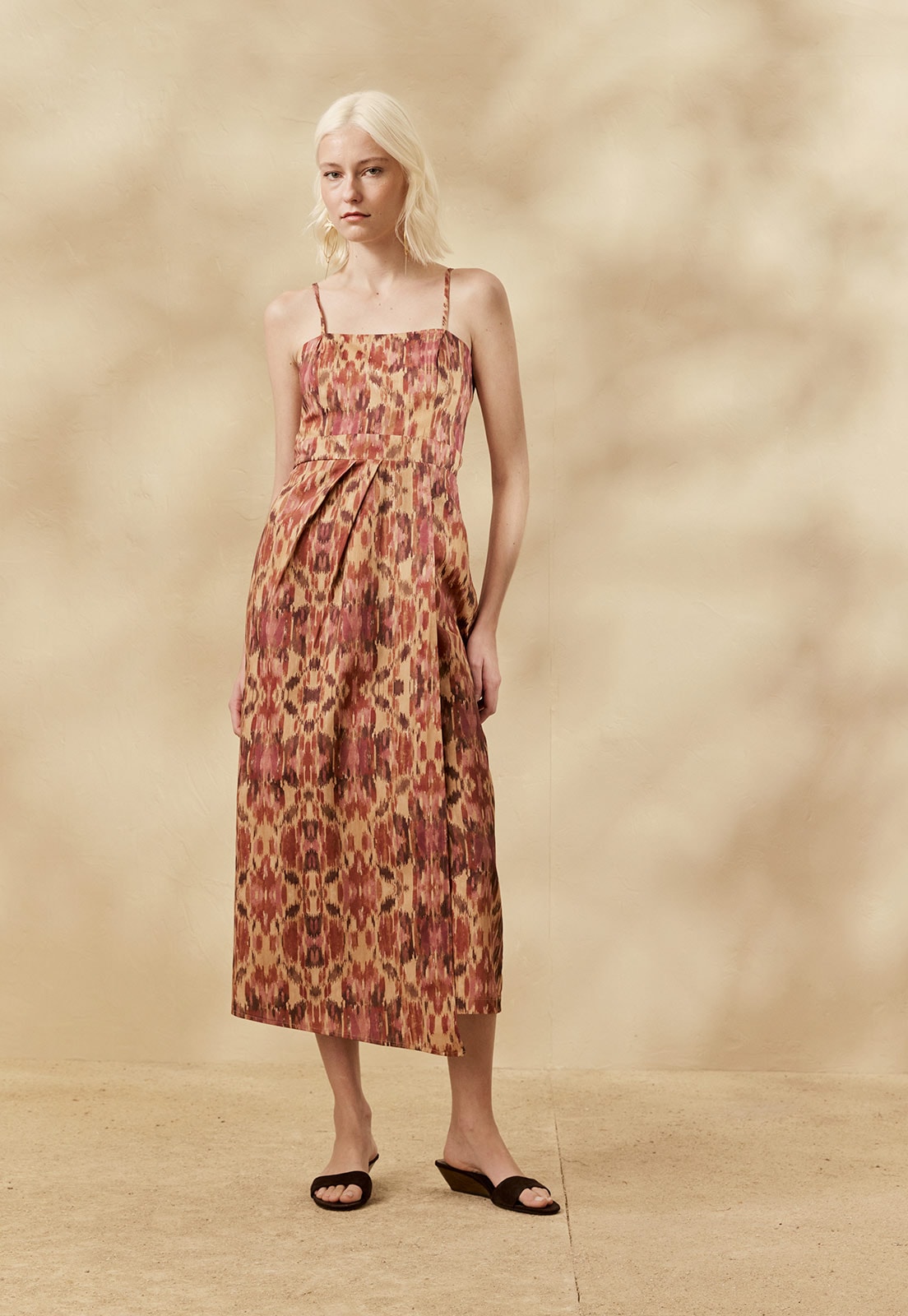 O Vestido Midi Pregas Estampado Niebla da CaCay apresenta modelagem com pregas que valorizam a cintura e trazem leve amplitude ao quadril, mantendo caimento elegante e confortável. O busto se ajusta suavemente, enquanto o comprimento midi alonga a silhueta com sofisticação e a amarração nas costas permite ajuste personalizado. A forma é grande. Se estiver em dúvida entre dois tamanhos, opte pelo menor. A modelo da foto tem 1,75m, veste manequim 36 e usa o tamanho P.