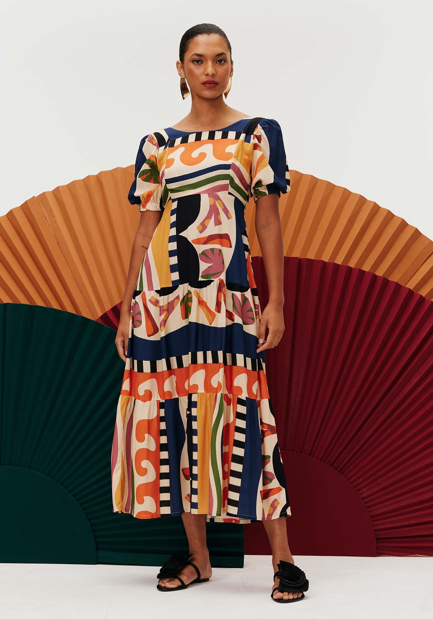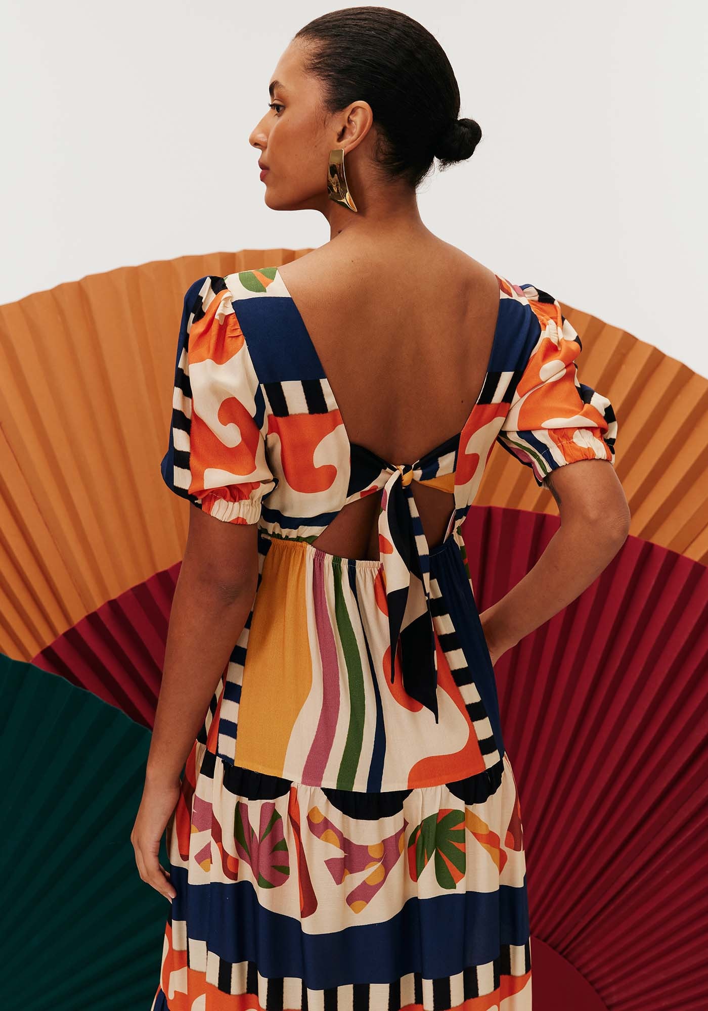Modelo elegante, o vestido midi é confeccionado em tecido 100% viscose e possui recorte no busto com decote alto arrendondado. A manga curta bufante tem lastex, podendo ser ajustada. As costas contém lastex e amarração, proporcionando maior conforto. A estampa samba possui diferentes formas orgânicas em cores que formam a combinação perfeita entre si.