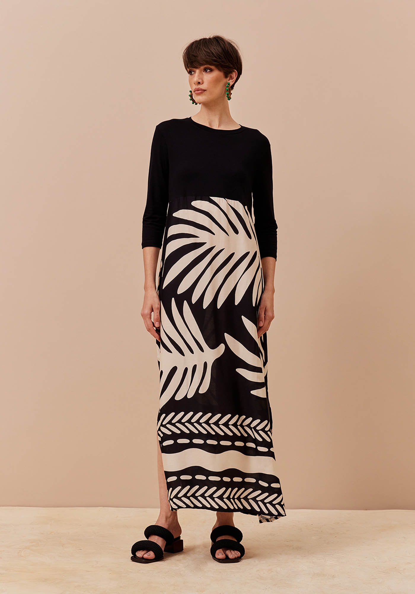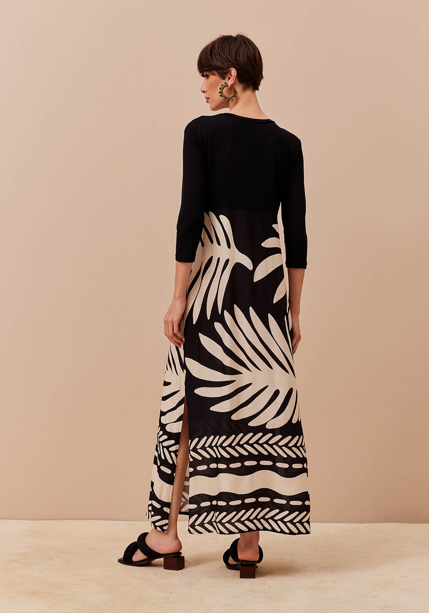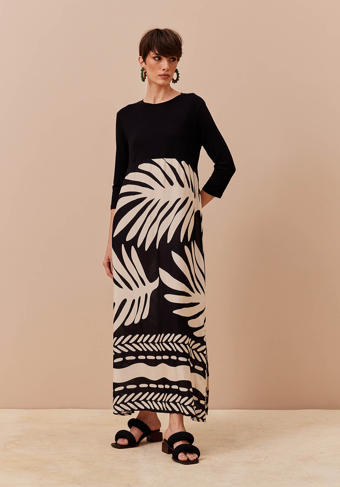 Este Vestido Longo estampadoé uma peça cheia de personalidade, perfeito para quem busca um visual queproporciona estilo e também conforto. Com gola redonda e manga 7/8, eleapresenta saia fluida com fendas nas laterais que proporciona leveza emovimento ao visual. Versátil e prático, ele é confeccionado na estampa encantadoraMaipú em P&B e sua composição é de 48%Viscose 43% Modal 5% Linho 4% Elastano na parte de tecido liso e 100% viscose na saia estampada.