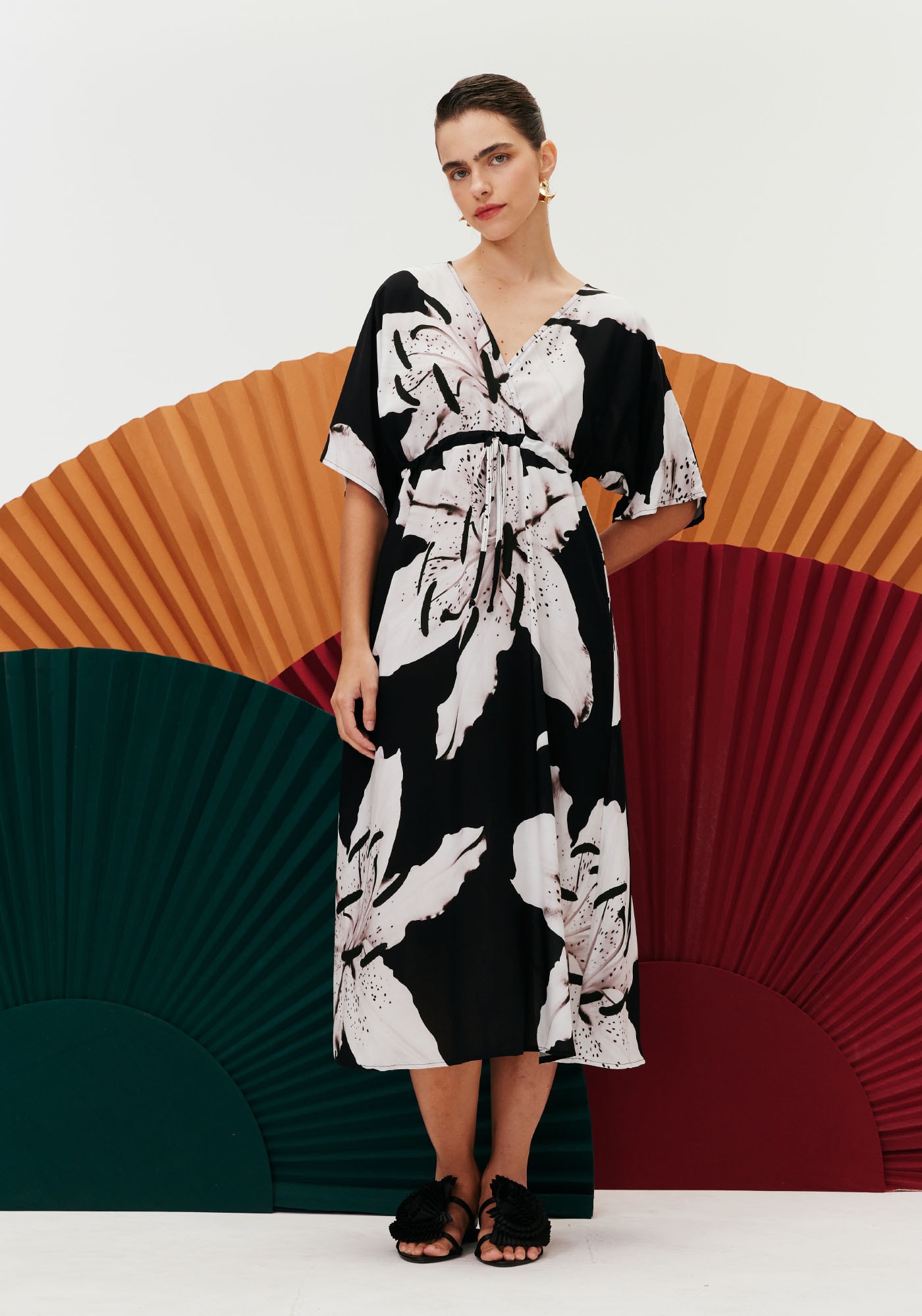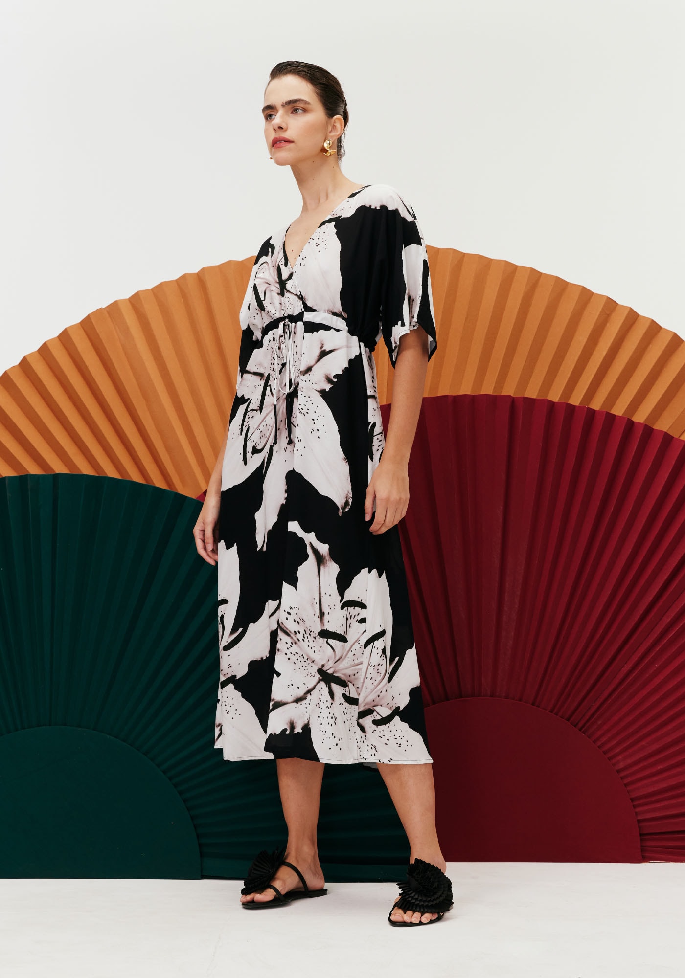 O vestido Mônica é um modeloclássico e versátil, que pode ser usado em diferentes ocasiões. É confeccionadoem tecido 100% viscose e possui mangas amplas e decote cruzado. A amarração emtúnel finalizada com ponteira valoriza a silhueta. A estampa Tango mistura o clássico P&B com aestampa floral em uma roupagem diferente.