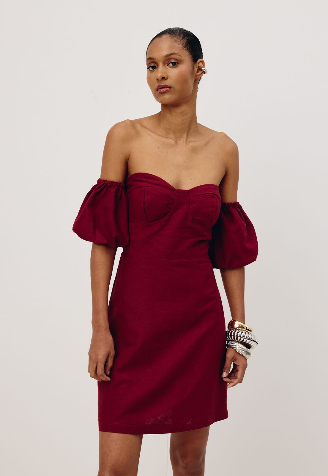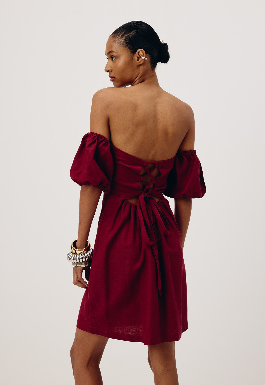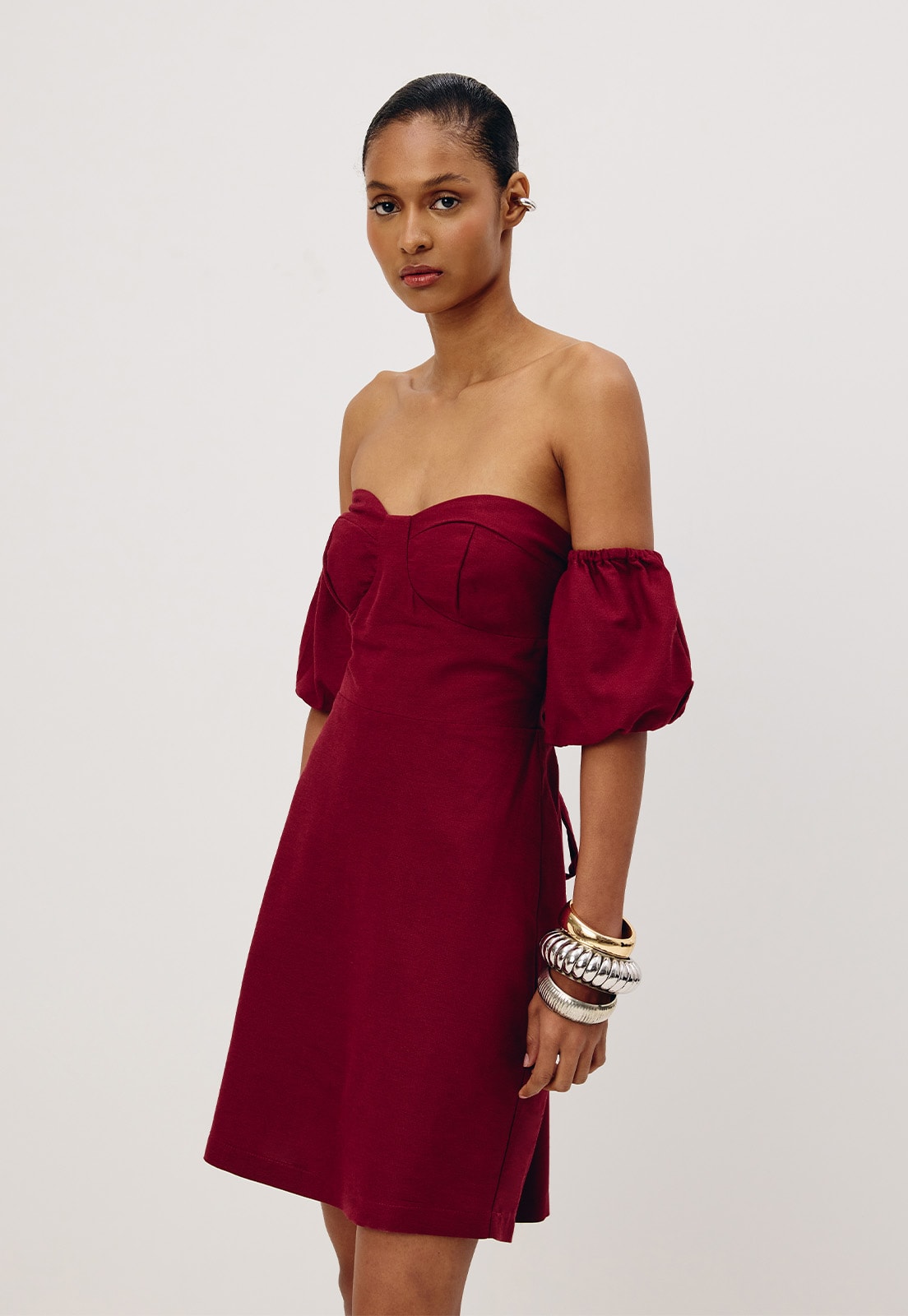 Confeccionado em tecido 42% algodão 38% viscose 15% modal 6% linho, o vestido curto é um modelo ombro a ombro com manga balonê cruzado nas costas. O modelo possui um decote arredondado, que valoriza o busto e o shape justo, que valoriza a silhueta.