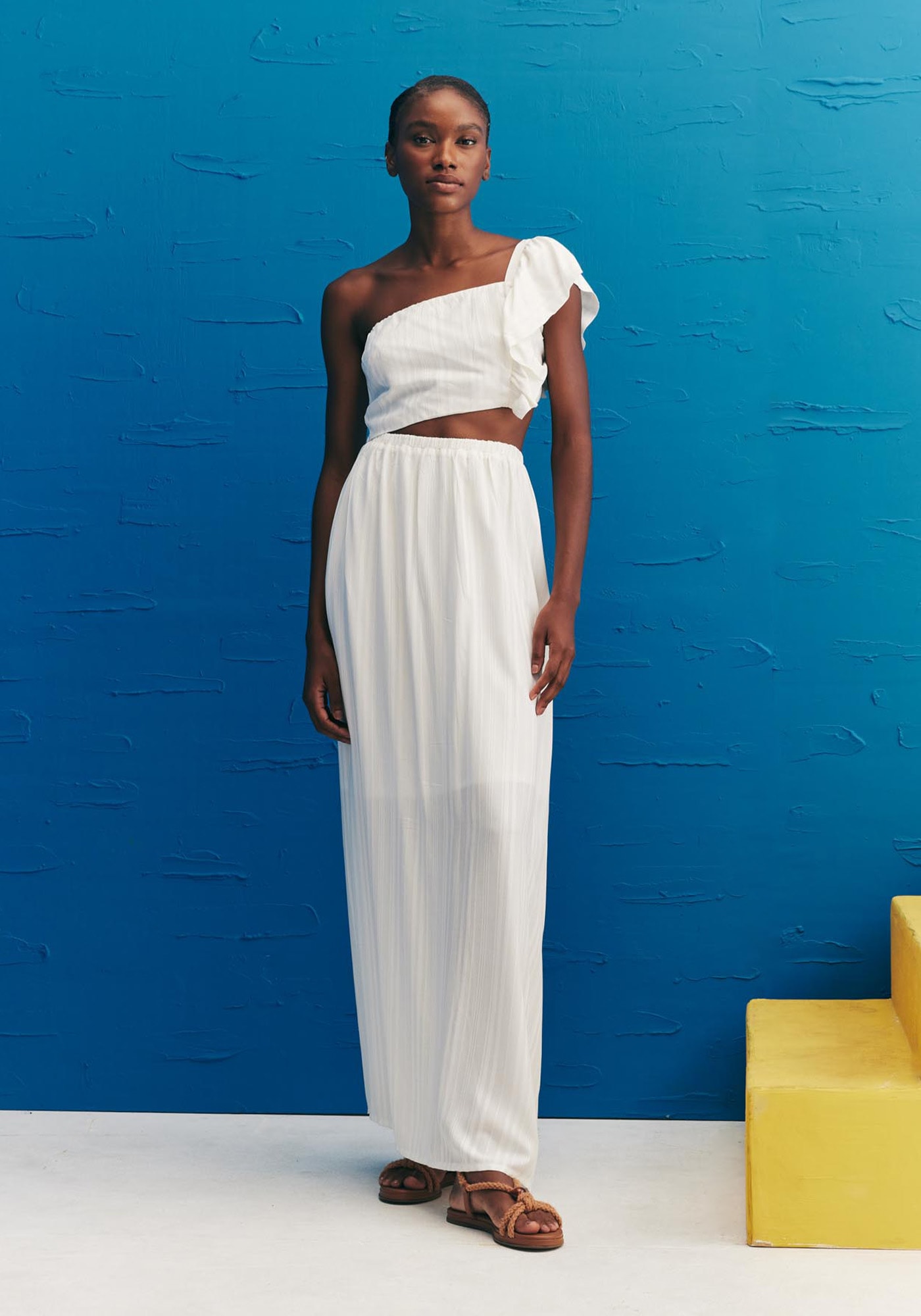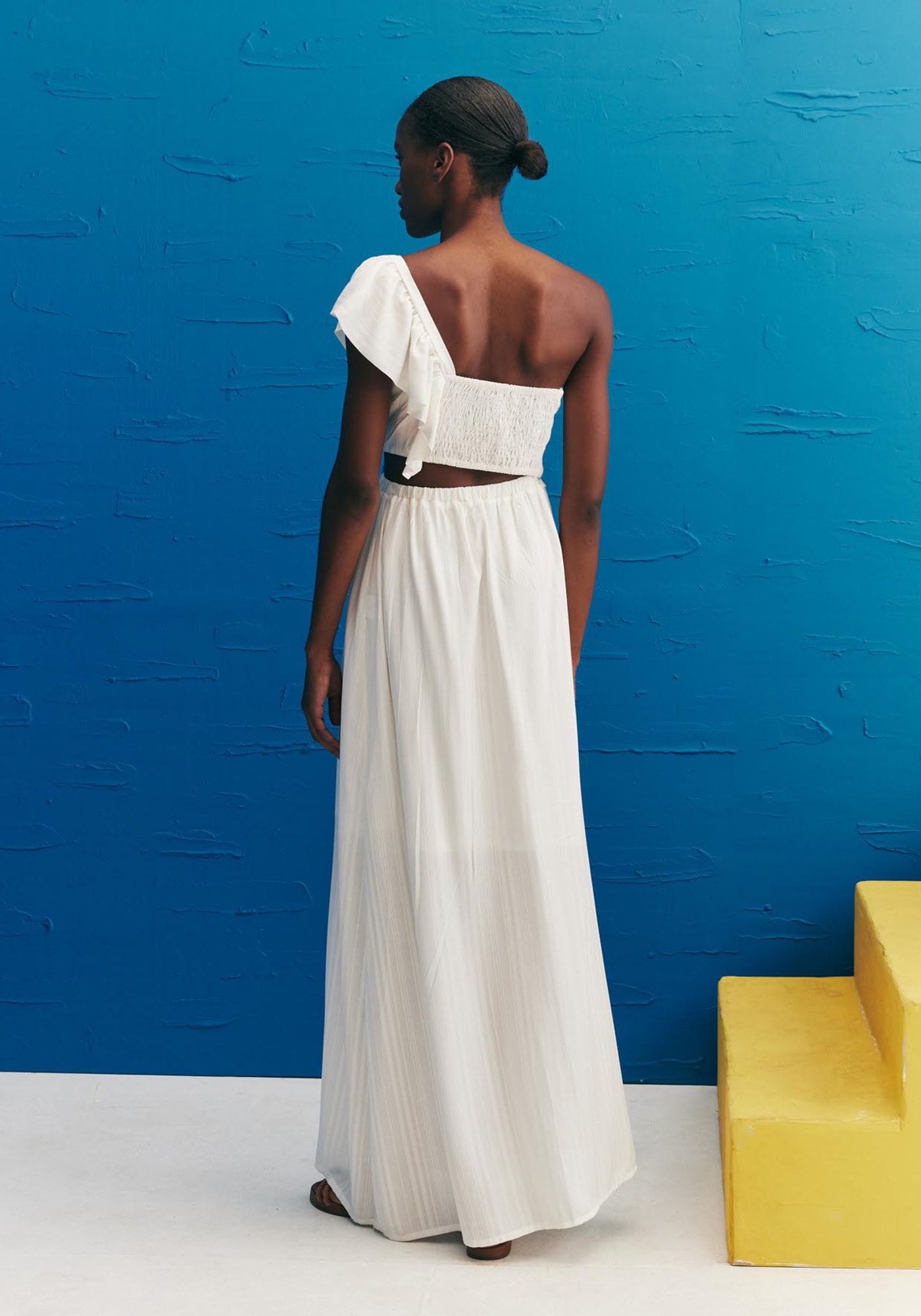 O vestidolongo liso é lindo e exuberante. Confeccionado em tecido 100% viscose, o modelode um ombro só conta com um recorte ousado na cintura. Possui lastex nas costase elástico na cintura, facilitando a vestibilidade. A manga estilo balonê é umcharme a parte.