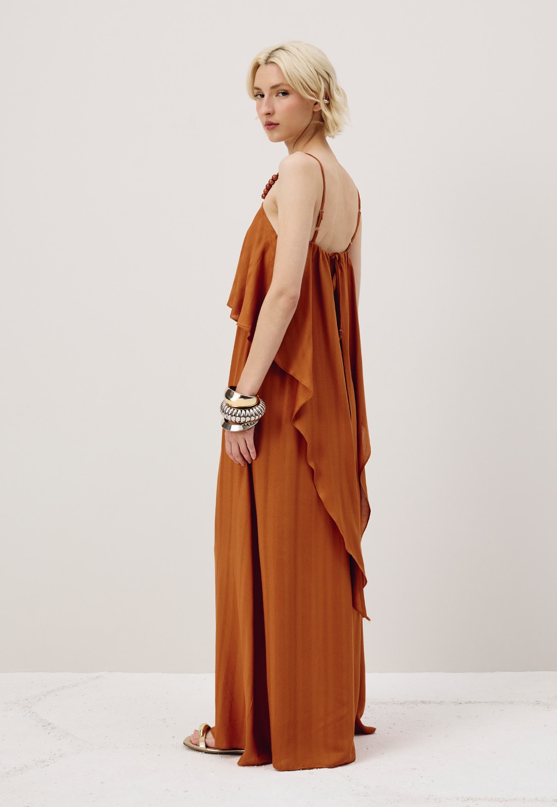O vestido longoé confeccionado em tecido 97% viscose 3% linho. O modelo liso possui um shape amplo e fluído e alças finas componteiras. A pala alongada nas costas é um detalhe charmoso, que completa o modelo.