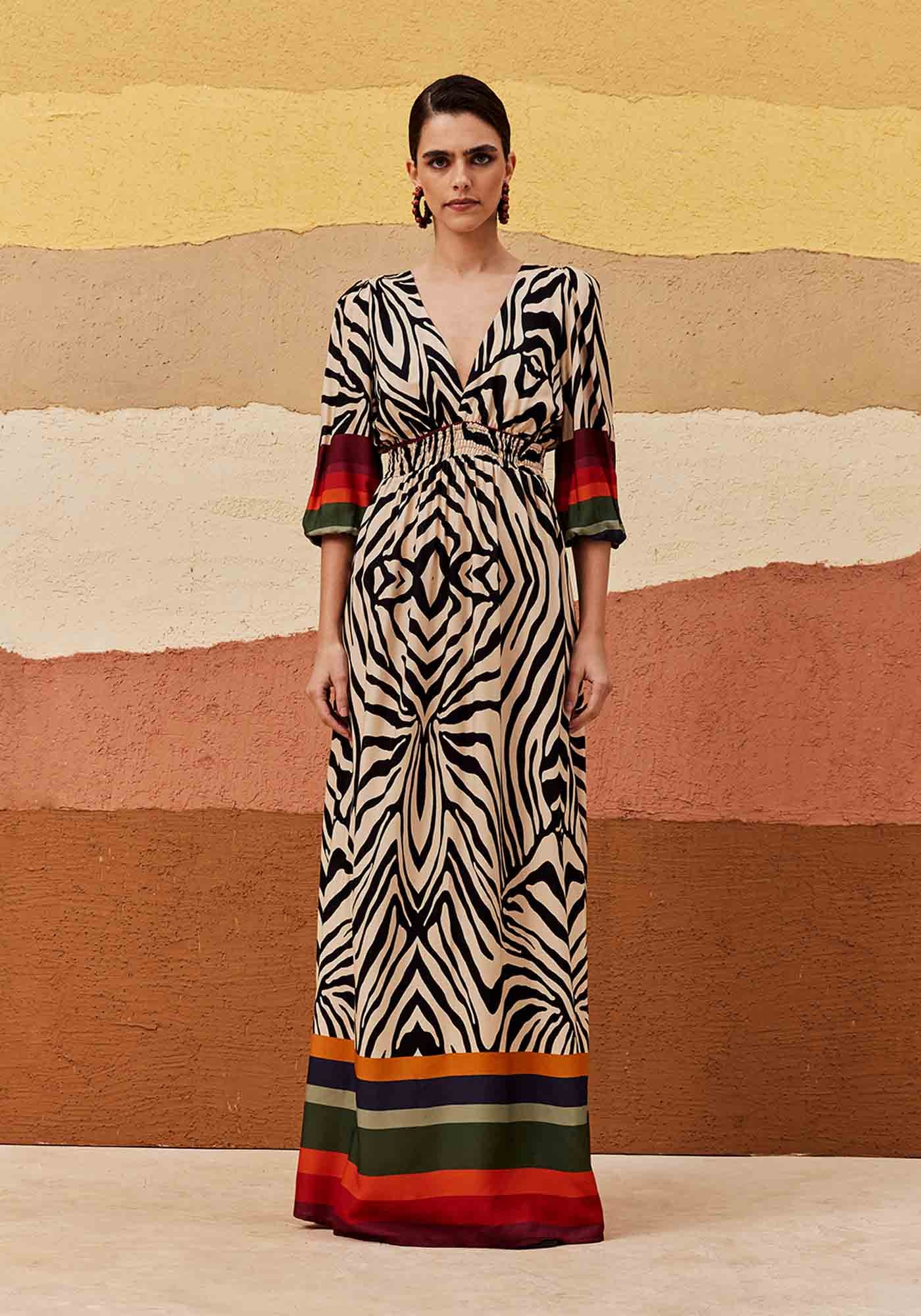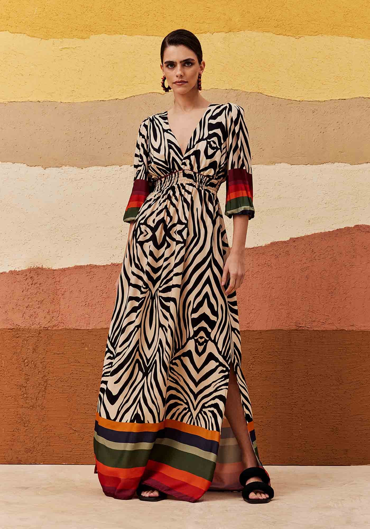 Detalhes O vestido estampado Zebra color é maravilhoso. Confeccionado em tecido 100% viscose, possui decote profundo e pala em latex abaixo do busto. O decote retangular nas costas com amarração é belíssimo e dá mais segurança e conforto. A manga bufante é o toque final da peça. A estampa animal print P&B com o barrado listrado colorido dá todo o charme para o vestido.