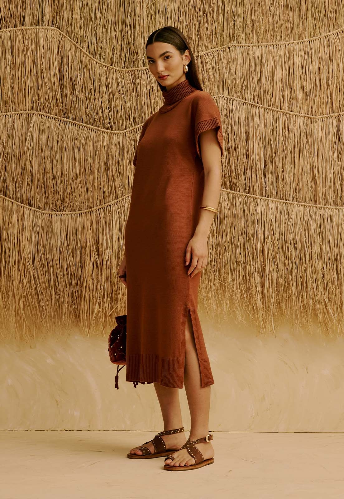 O Vestido T-Shirt em Tricot com Gola Alta da CaCay apresenta modelagem reta e elegante, com caimento confortável que acompanha suavemente o corpo, finalizando em comprimento abaixo dos joelhos. A forma é grande, por isso, se houver dúvida entre dois tamanhos, a recomendação é optar pelo menor e consultar a tabela de medidas para precisão. Na foto, a modelo tem 1,75m de altura, veste manequim 36 e usa o tamanho P.