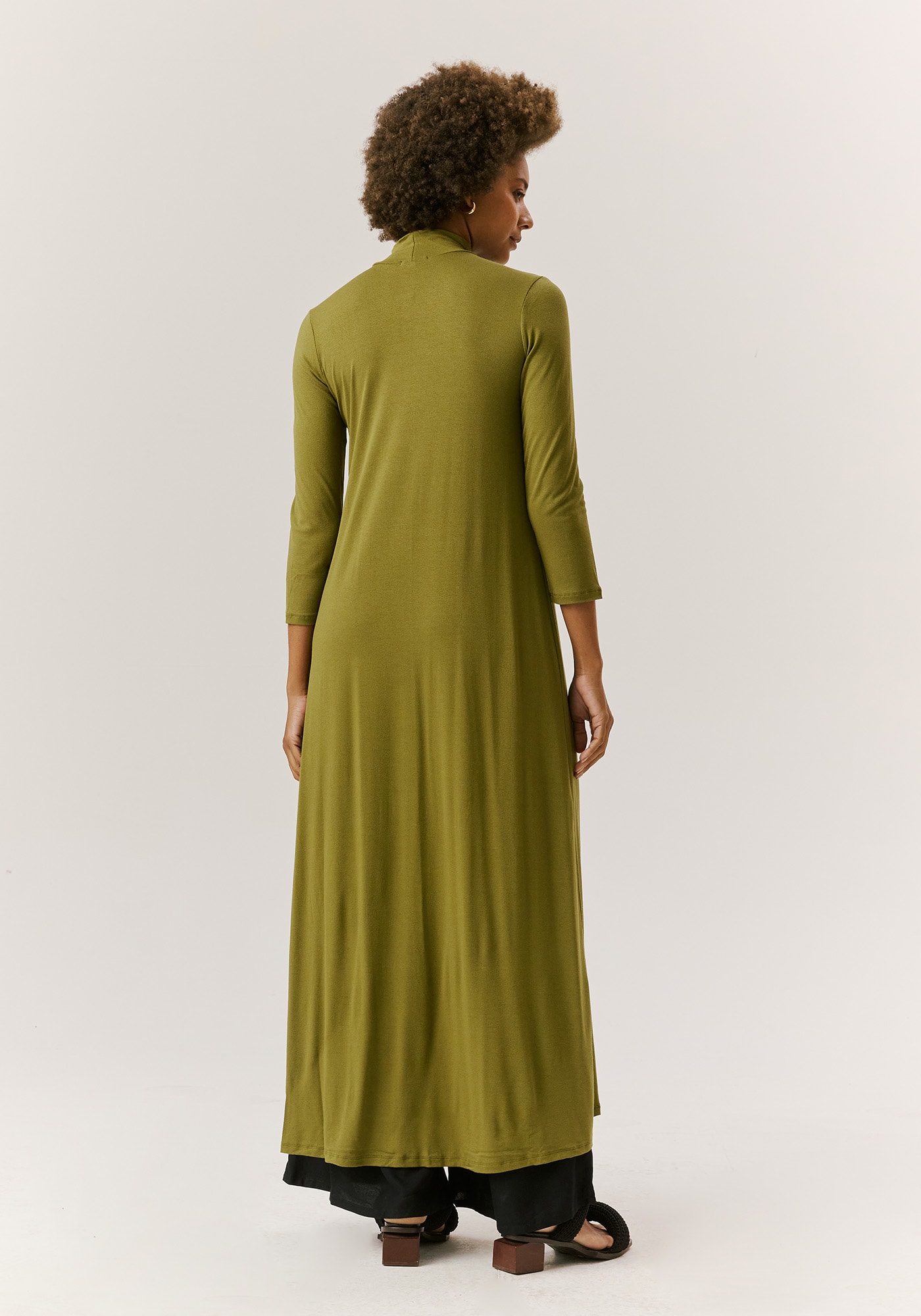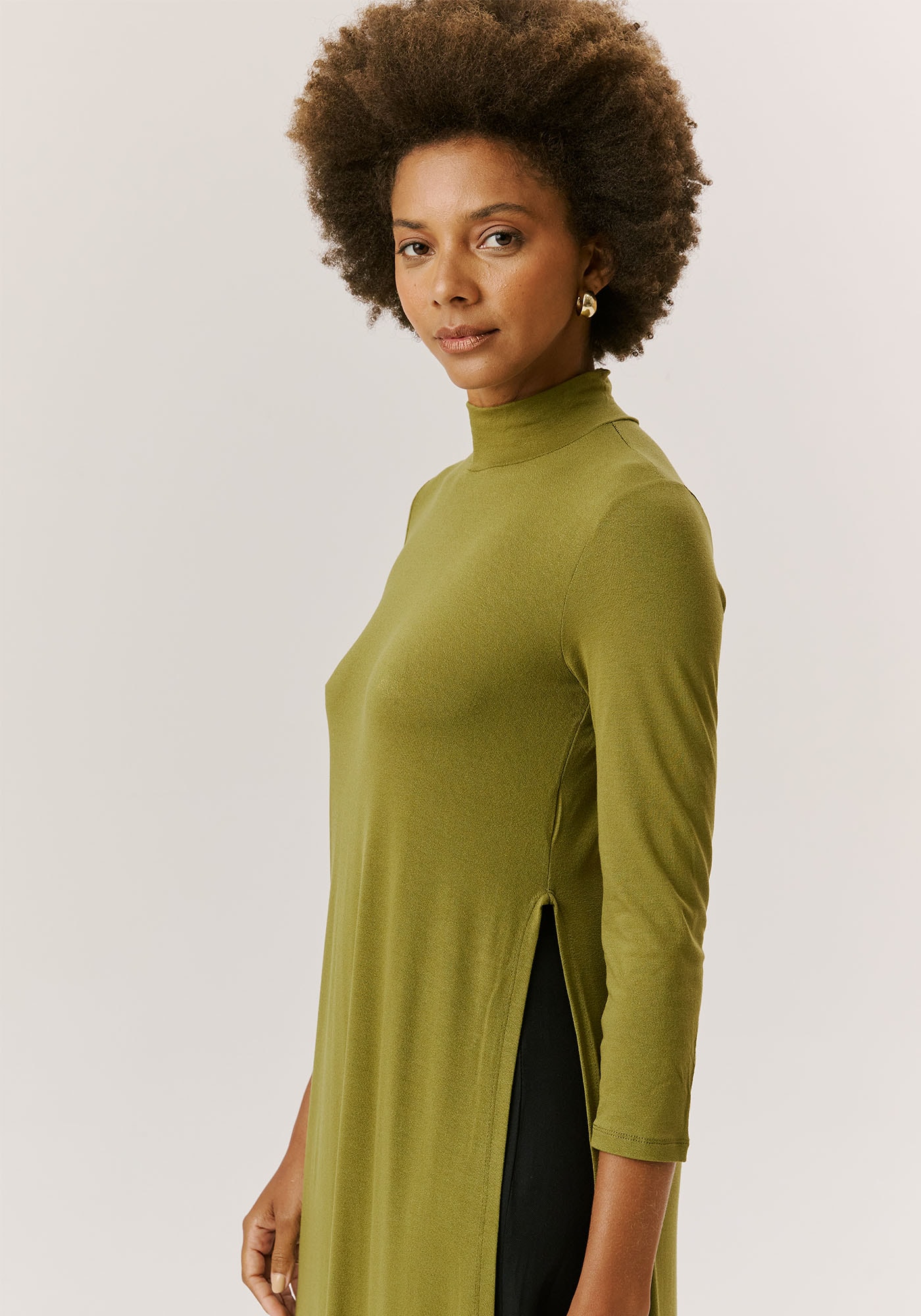 Confeccionado em malha 96% viscose4% elastano, o vestido túnica une conforto e elegância. O modelo possui golaalta, deixando o look mais sofisticado e fendas laterais, que dão leveza emovimento à peça.