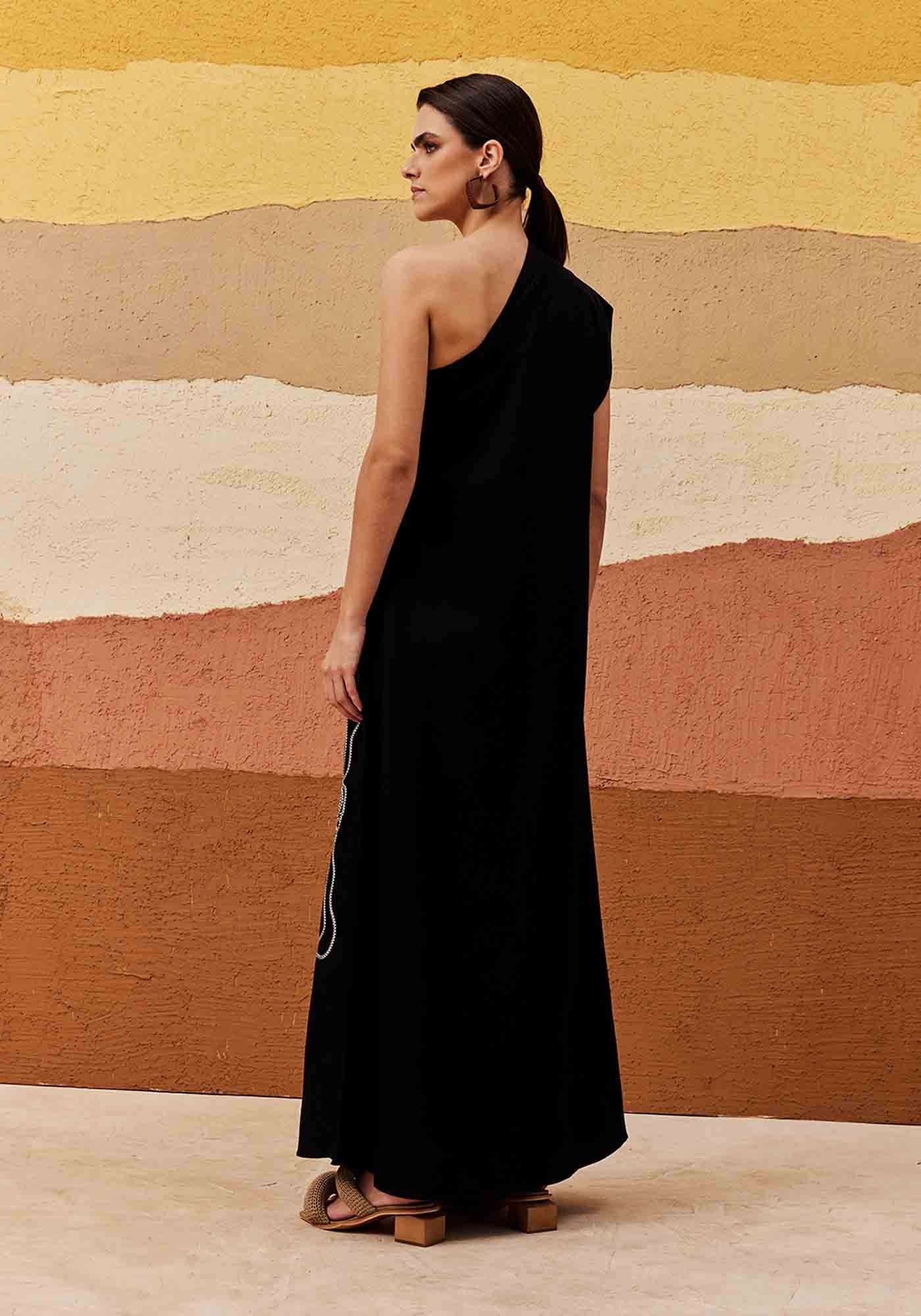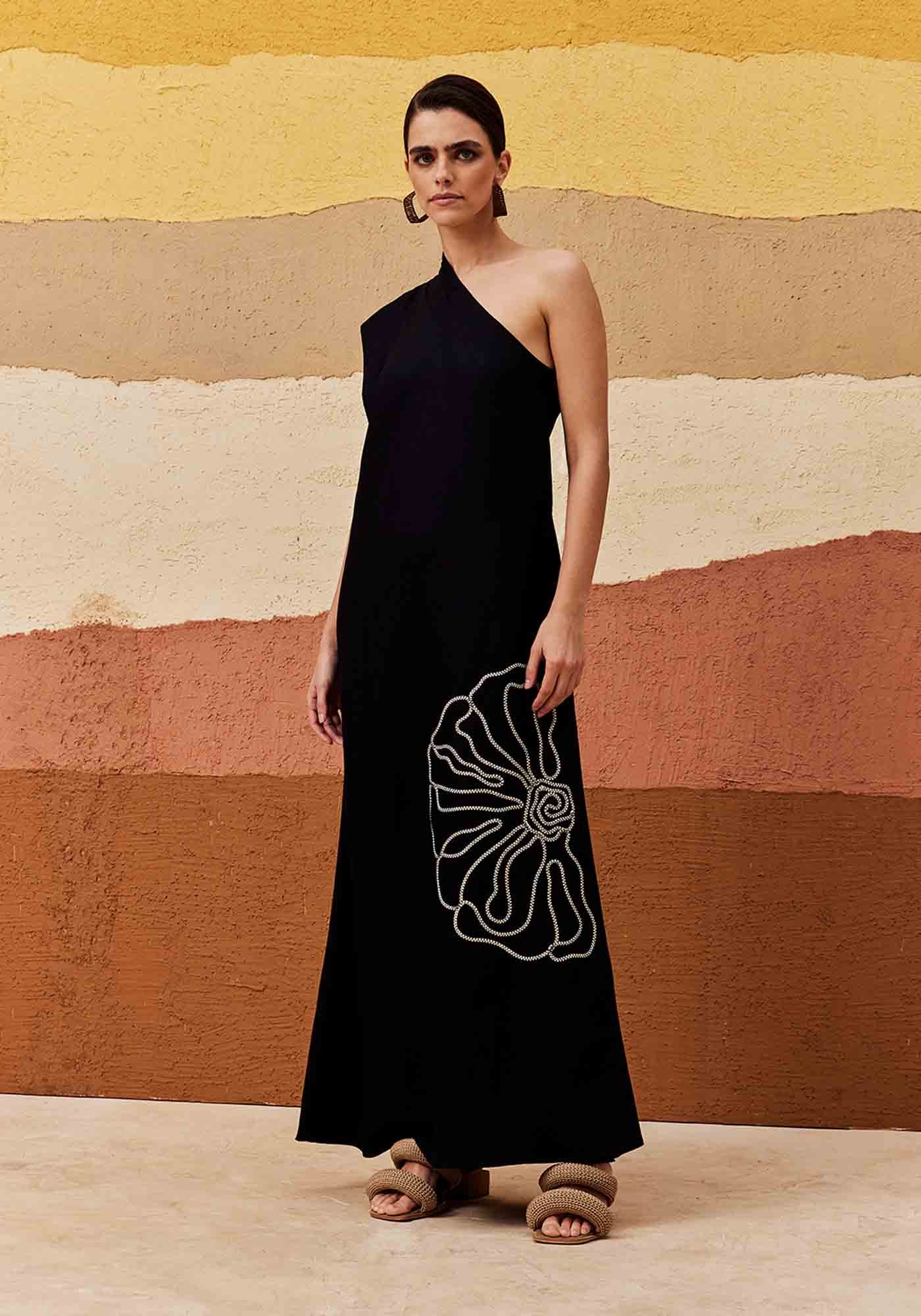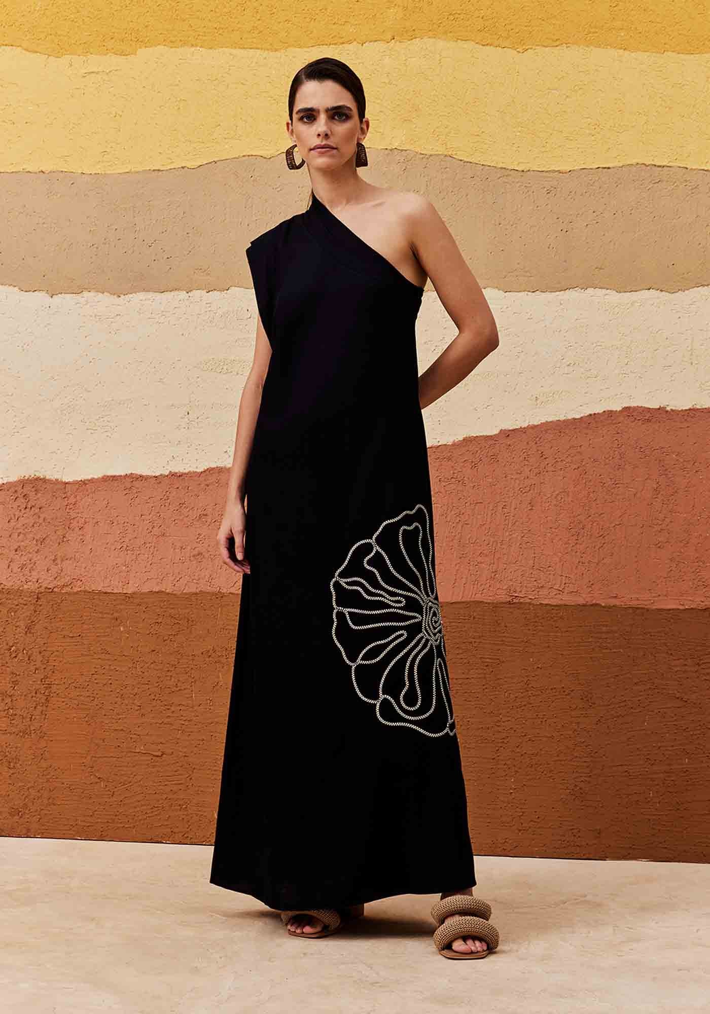 Ovestido liso bordado traduz o que é elegância. Confeccionado em tecido 50%algodão 29% viscose 15% modal 6% linho, é um modelo de um ombro só com bordado belíssimoe delicado de flor na parte da frente, que contrasta com a cor do tecido.