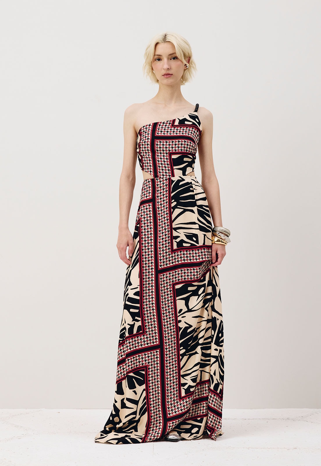 Com silhueta marcante e recortes estratégicos, esse vestido longo traz um visual sofisticado e atual. A alça única com detalhe sutil valoriza o colo, enquanto os recortes na cintura desenham o corpo com elegância. A saia ampla garante leveza ao caminhar, e o lastex nas costas oferece conforto e melhor ajuste na parte superior. Fechamento em zíper invisível nas costas. Confeccionado em 100% Viscose, tem toque suave e caimento fluido.
